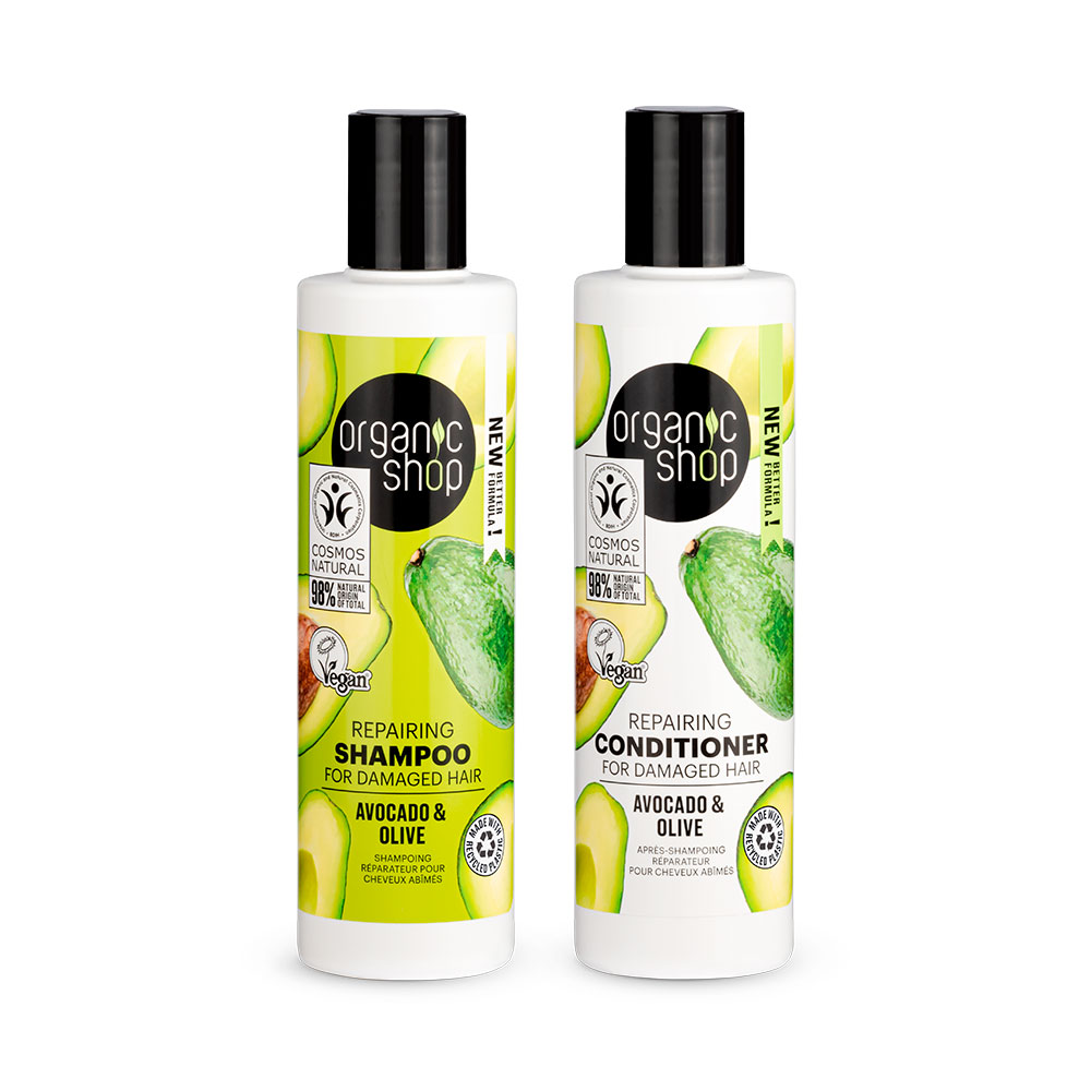O Kit shampoo e Condicionador Reconstrução Cabelo Danificado Organic Shop é composto pelos seguintes produtos: