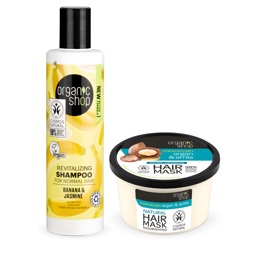 O Shampoo Banana e Jasmim Organic Shop limpa suavemente enquanto ajuda a fortalecer os fios e proteger contra o enfraquecimento e a quebra. A Máscara de Nutrição Capilar Óleo de Argan e Amla Organic Shop oferece nutrição equilibrada, com foco em reposição lipídica e maleabilidade, ajudando a manter o fio macio e com brilho.
